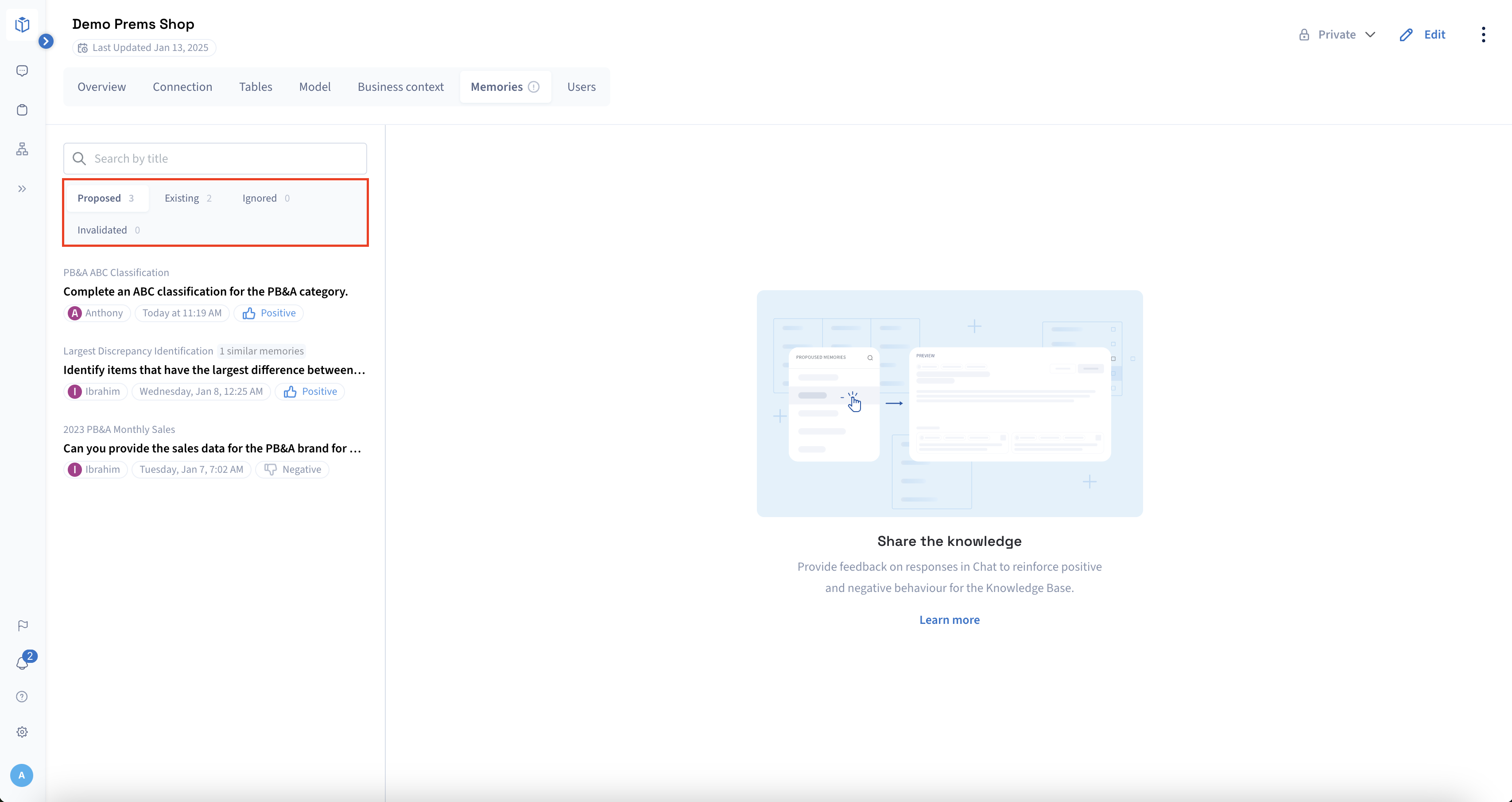 When in Edit mode in a particular Knowledge Base, in addition to the browse actions, each memory record under proposed (as well as committed and rejected) can have it's status changed.