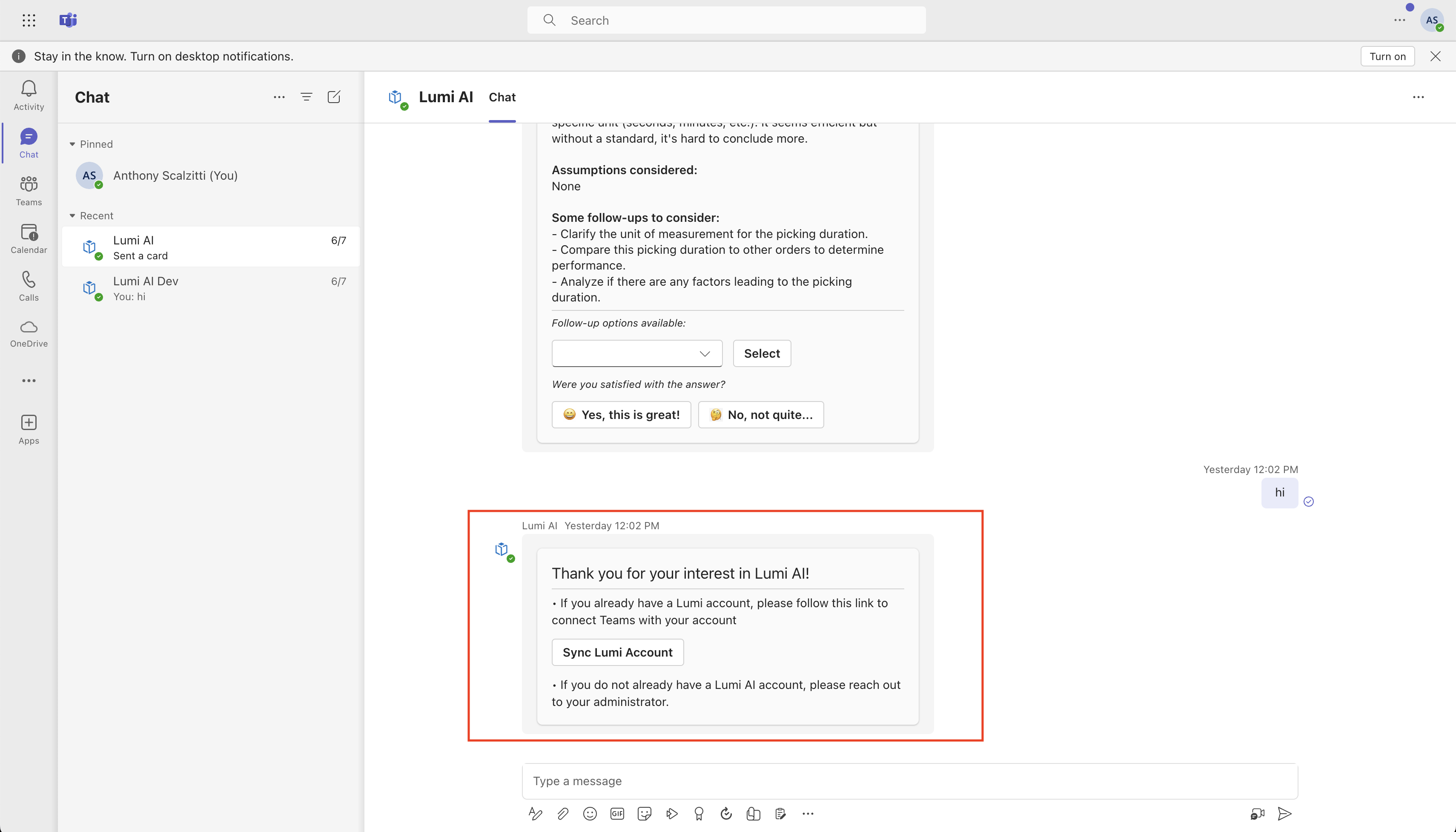 You can now interface with Lumi AI as you would in the web app chat. Note the limitations in previously described [here](https://docs.lumi-ai.com/product-features/secondary-interfaces).