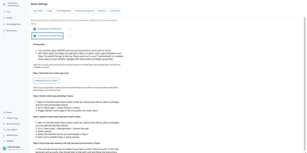 The broader instructions to enable Microsoft Teams for the organization are available for (and must be executed by) Admins in [Org Settings > Tool Integrations](https://docs.lumi-ai.com/product-features/organization-settings/tool-integrations).