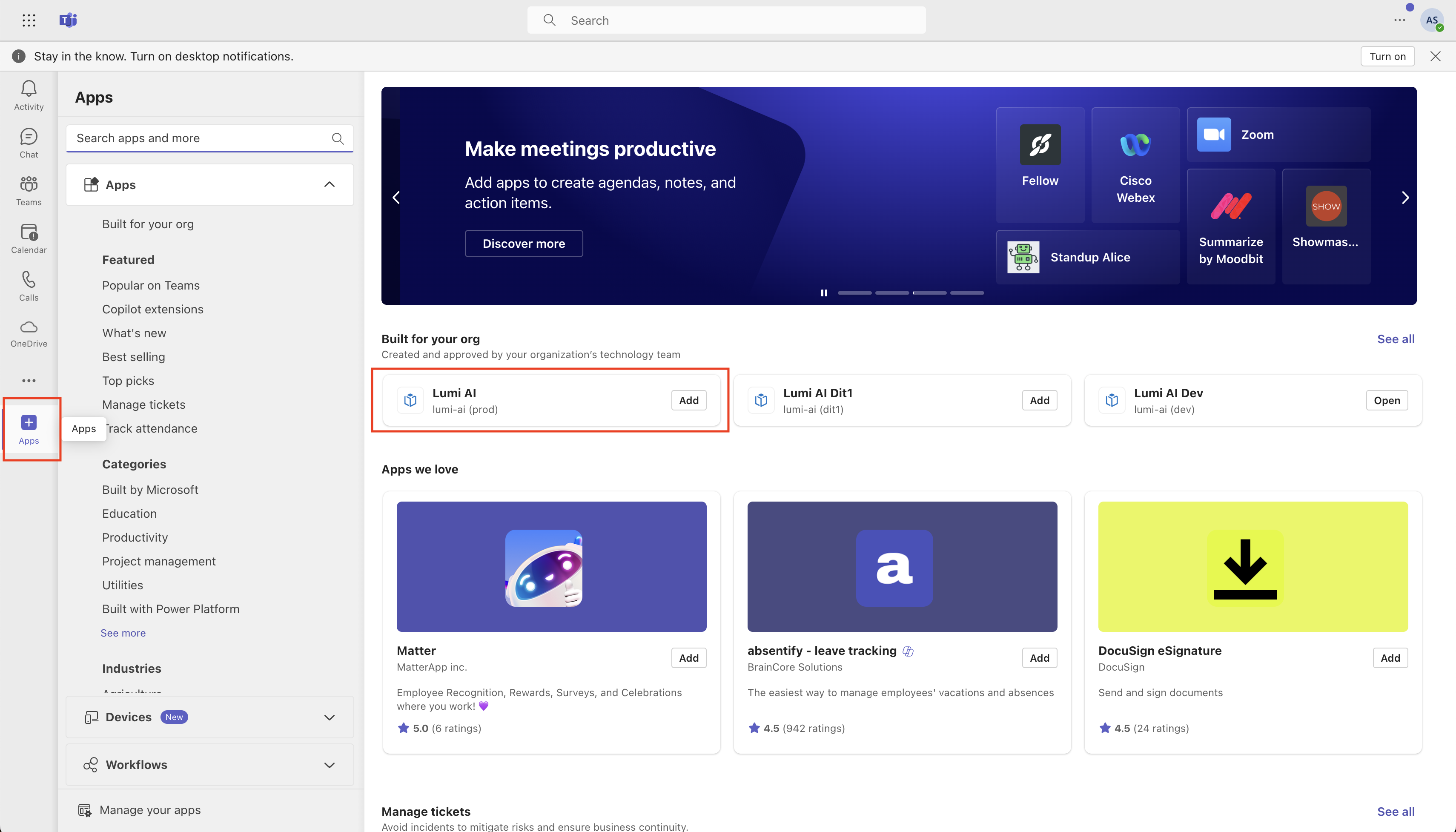 If not available, and the admin has added the bot (see [Step 1](#step-1-admin-enablement)), you may need to add the Lumi apps on MS Teams workspace.&#x20;