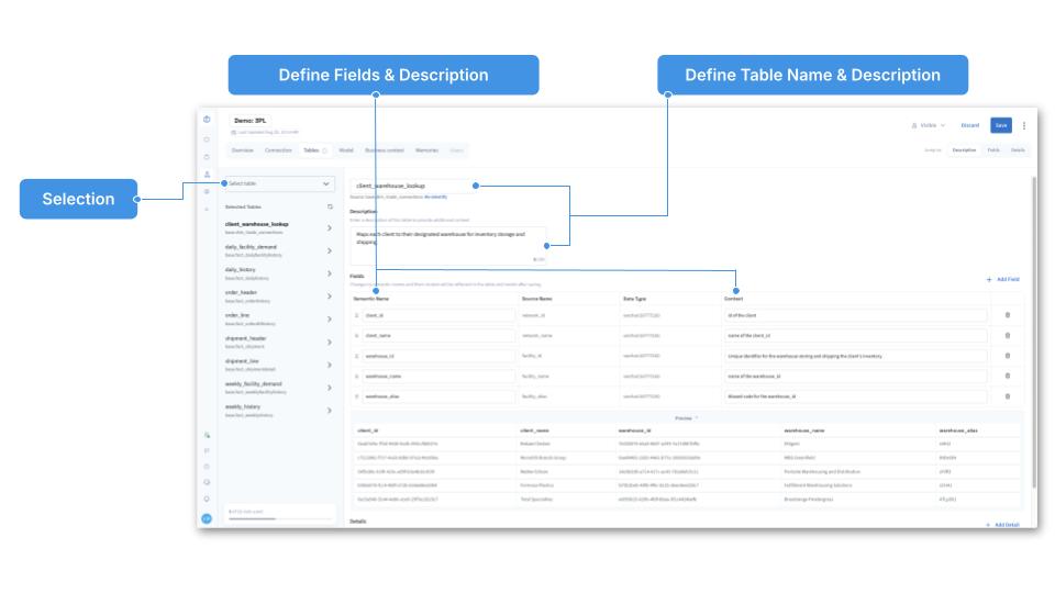 Once a table is selected, provide a table name and add context describing what the table is about. Most databases tend to use an unusual table naming convention. We highly recommend you re-name the table into a more human-readable format. This will drastically improve Lumi’s ability to generate accurate code. For more details, refer to the best practices below.